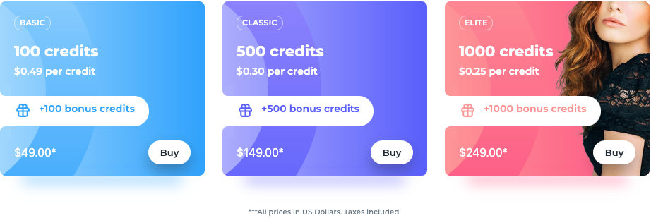 A message to contact a woman costs 8 credits, or 13 credits for a priority contact. Opening a message received from a woman costs 5 credits. After the first message, conversations are free, except if you send virtual gifts, which cost 20–50 credits. In order to chat live, you will need to use 30 credits for 30 minutes and 60 credits for 60 minutes.
