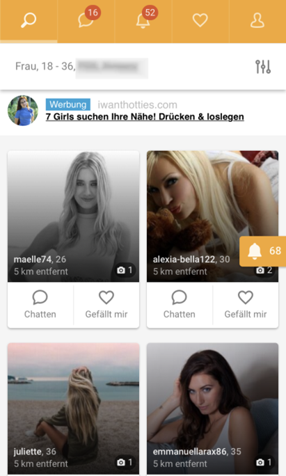 Die "Gefällt mir-Galerie" ist wesentlich mehr als eine Galerie der bevorzugten Profile. Hier findet man auch ein Profile-Karussell mit Bildern, mit dem neue Mitglieder gefunden werden für neue Kontakte. Klicken Sie auf das Kreuz oder das Herz, um neue angezeigt zu bekommen. Wenn man auf ein Herz klickt, wird das Mitglied benachrichtig, wodurch das Eis schnell gebrochen wird. Darunter sind zwei Kategorien zu sehen: „Treffer“ und „Likes“. Mit diesen ist es möglich, zu sehen, wer Ihr Profil mag und wen Sie geliked haben, damit Sie den Kontakt aufnehmen können.