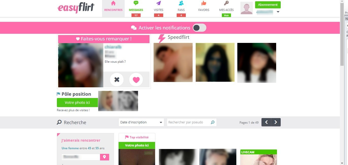 A l’usage, on a rapidement trouvé sur Easyflirt les outils qui nous permettent d’avoir toujours un œil sur ce qui se passe dans notre sphère. Pour voir qui a visité notre profil, il suffit d’aller dans l’onglet « Visites ». On peut aussi retrouver les personnes qui nous ont remarquées dans « Fans » celles qu’on a remarquées dans « Favoris ».