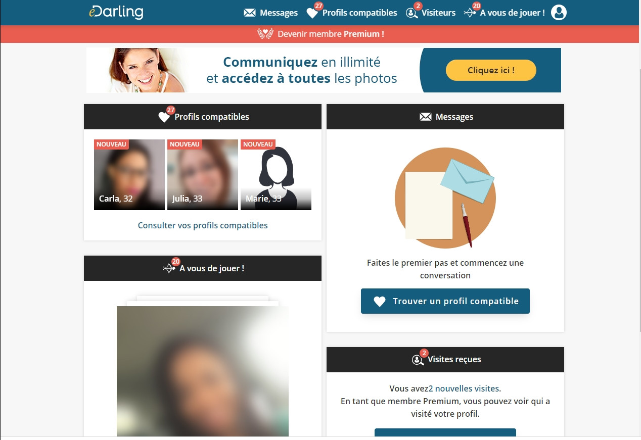 Grâce au test de personnalité, le système de matching proposé par eDarling donne de très bons résultats. Pour les voir, il suffit de se rendre dans la section « Profils compatibles ». Disponible dans le menu du haut. Chaque jour, on y trouve environ 20 à 30 profils dont le taux de compatibilité est élevé par rapport au nôtre. C’est sans hésitation la section la plus importante du site.