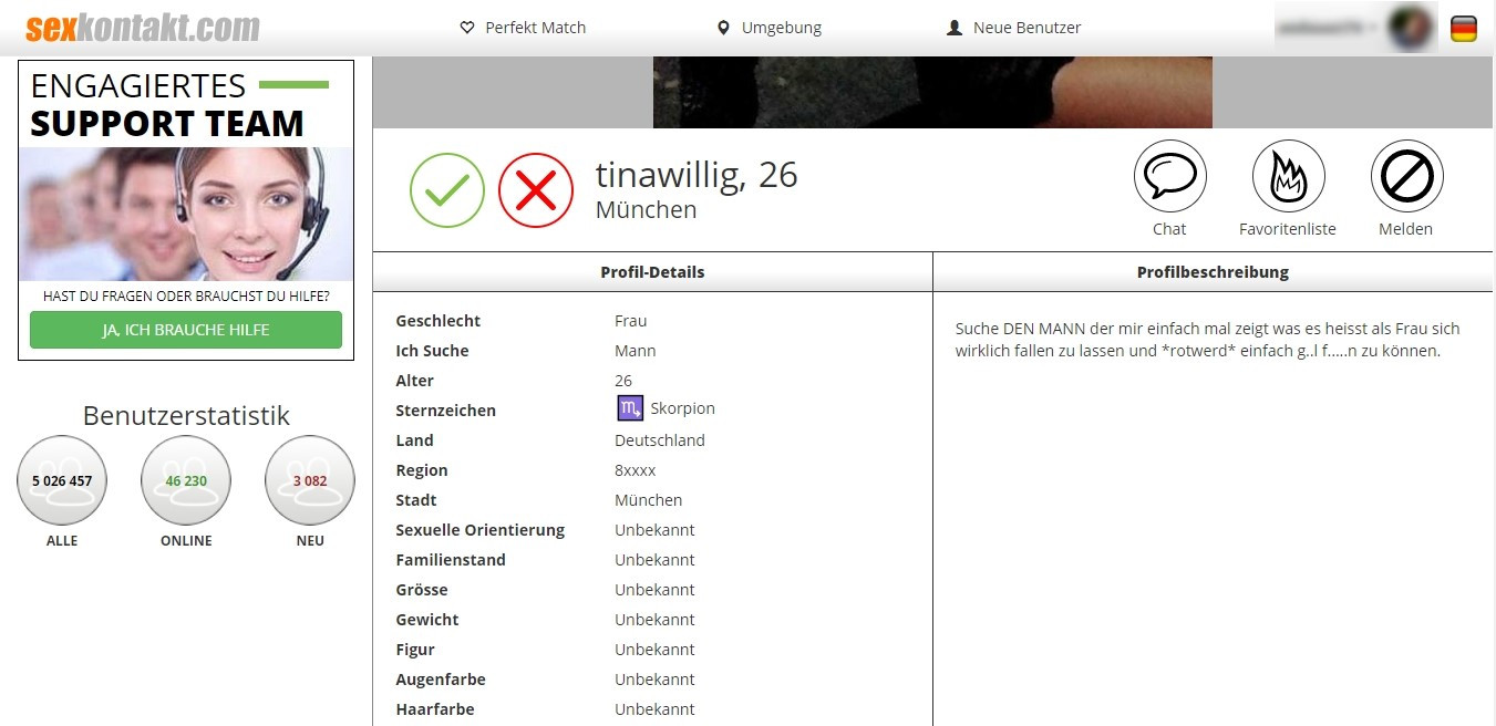 Die Suchfunktion befindet sich auf der Landing-Seite nach dem Einloggen auf Sexkontakt. Sie bietet uns einige nützliche Filter, ist leicht zu benutzen und ziemlich effizient. Wir können wählen, ob wir Profile mit oder ohne Foto angezeigt bekommen haben wollen. Abgesehen davon ist das Sortiersystem eher herkömmlich: Familienstand, Altersgruppe, Geschlecht, Region. Diese Webseite unterscheidet sich in einem Punkt leider nicht von den anderen Seiten: Es ist leider nicht möglich, Suchanfragen nach sexuellen Vorlieben durchzuführen.