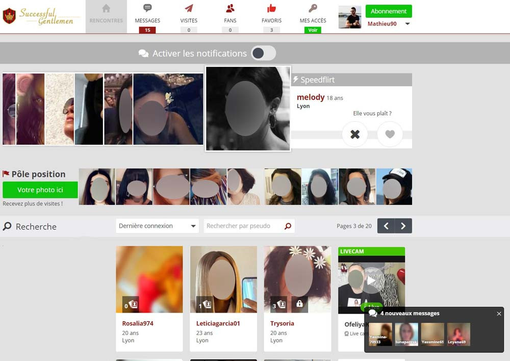 L’un des aspects que nous avons particulièrement apprécié sur Successful Gentlemen, c’est la possibilité de se faire très discret. Comme nous vous le disions un peu plus tôt, vous pouvez en effet choisir de bloquer votre profil. De cette manière, votre photo apparaîtra en flouté. Et c’est vous qui déciderez si vous souhaitez dévoiler votre identité. En revanche, il faudra faire preuve d’originalité au niveau de votre description si vous voulez que tout ce mystère attise la curiosité de ces dames ! Nous avons nous-même testé le mode incognito, et il est vrai que le nombre de messages reçus spontanément diminue un peu.