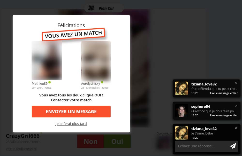 Vous connaissez sans doute le principe des Matchs de Tinder : on vous propose un profil sélectionné en fonction de vos goûts. Si vous aimez un profil qui a aussi aimé le vôtre, alors vous pouvez discuter ensemble. Sur TonPlanCul, c’est un peu la même idée sauf qu’ici on va droit au but : la question n’est pas de savoir si vous aimez le profil de l’autre mais si vous souhaitez que ce soit votre plan cul. Au moins, les choses sont claires dès le début et cela permet de gagner un temps fou !